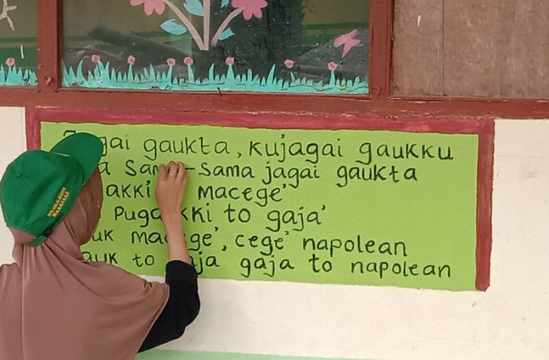 Karena mereka berjumlah tujuh orang, lima diantara mereka adalah perempuan, maka mereka saling berbagi tugas. Ada yang masuk kelas mengajar dan lainnya melukis atau menulis slogan di dinding.