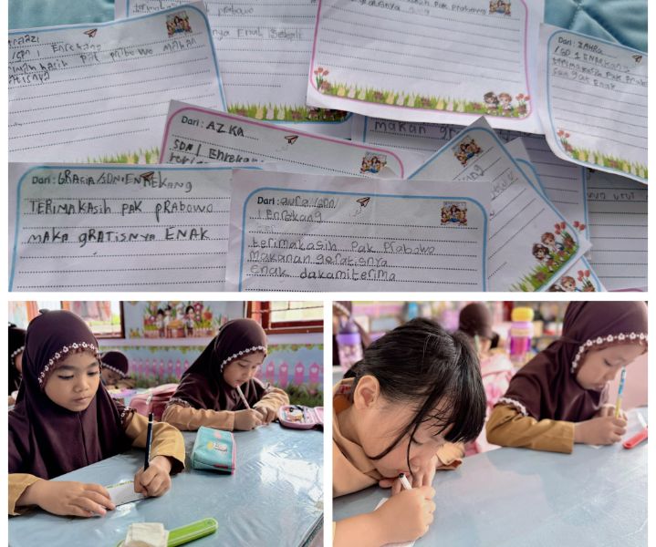 Kertas-kertas kecil itu ditempelkan di papan kelas, dan menjadi pajangan haru yang membuktikan bahwa hati anak-anak sesungguhnya sangat peka dan tahu berterima kasih. Bagi mereka, Presiden bukan sekadar sosok pemimpin negara, tapi juga “teman makan siang” yang membuat hari-hari mereka lebih indah.