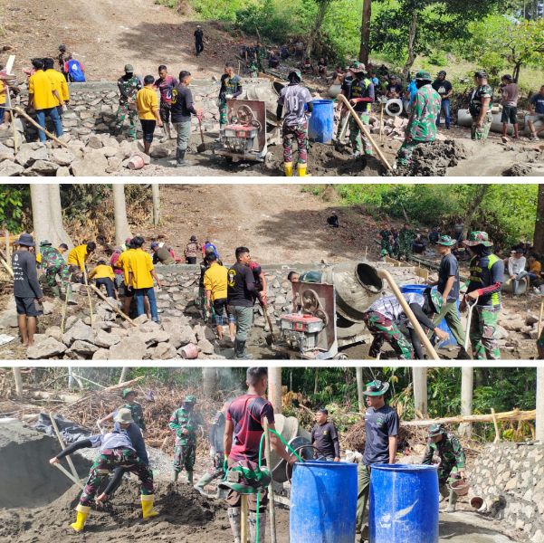Terlihat sinergi kuat antara TNI, Polri, dan warga setempat yang bahu-membahu mengangkat material, melakukan pengecoran,. Semangat kebersamaan ini mencerminkan kemanunggalan TNI dengan rakyat dalam mendukung percepatan pembangunan di pedesaan.