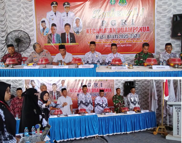 Pinrang, SUARAGURUSULSEL.COM – Dipandu Master of Ceremonial (SC) Muliyana, S.Pd, memulai kegiatan Konferensi Kerja Cabang (Konkercab) I PGRI Cabang Duampanua tahun 2026 Masa Bakti 2025-2030, dilanjutkan Pembacaan Ayat Suci Al Qur’an oleh Erni Kasim, S.Pd., M.Pd, menyanyikan lagu Indonesia Raya dan Mars PGRI dipimpin Diregen Rajawali, S.Pd.I, M.Pd.I, dan Pengucapan Ikrar Guru oleh Harliman Ds, S.Pd bertempat di Gedung Guru PGRI Duampanua, Pekkabata. Sabtu, (25/4/2026).